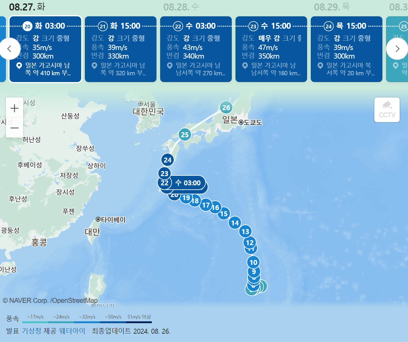 26일 현재 남쪽 해상에서 북서진하면서 27일 서일본에 접근할 것으로 보인다.